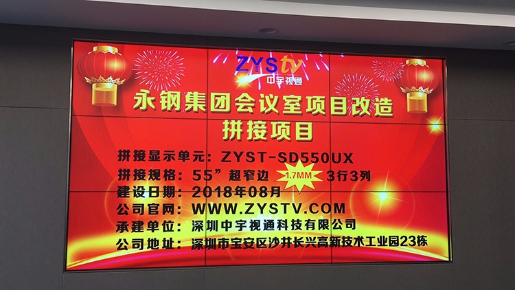 永鋼集團(tuán)會(huì)議室55寸17.mm拼縫3行3列拼接屏項(xiàng)目采用中宇視通科技拼接屏方案,項(xiàng)目安裝調(diào)試完成并順利驗(yàn)收。