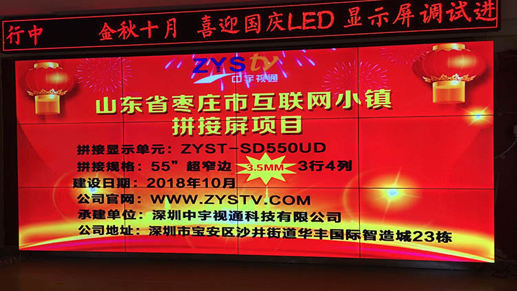山東棗莊市互聯(lián)網(wǎng)小鎮(zhèn)55寸超窄邊3.5mm3行4列液晶拼接屏項(xiàng)目,安裝調(diào)試完成并且順利驗(yàn)收,中宇視通科技全體職工從深圳發(fā)來(lái)賀電!