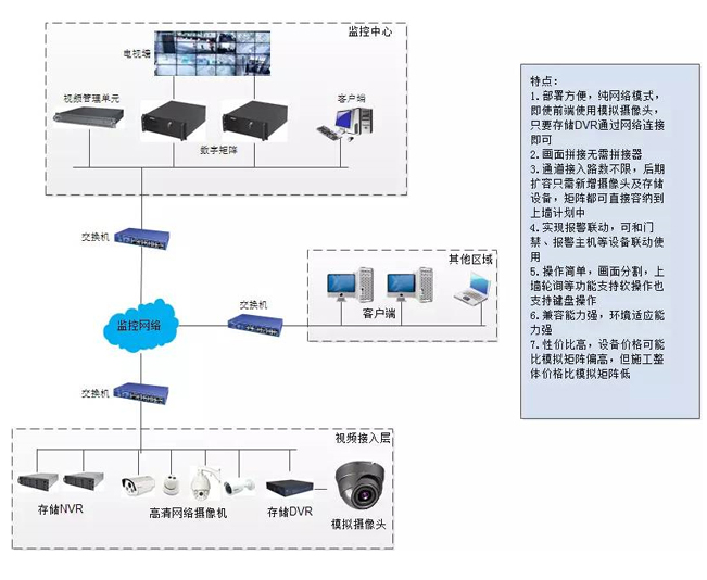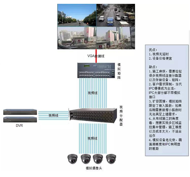 常見的結(jié)構(gòu)圖如上,這種運(yùn)用場(chǎng)景下,應(yīng)該說是一種專業(yè)上墻辦法了。我們可以看出,雖然仿照矩陣本身不貴,但要運(yùn)用許多的視頻線,甚至光端機(jī),并且有必要要從攝像機(jī)所在位置拉線到中心來,這個(gè)施工本錢會(huì)非常高。更重要的一點(diǎn)是,這種辦法更適合 仿照攝像機(jī)和DVR,但高清網(wǎng)絡(luò)時(shí)代,大部分IPC根柢沒有視頻輸出,那么這種辦法就會(huì)墮入死局,這也是傳統(tǒng)的仿照矩陣廠商在高清時(shí)代碰到的一個(gè)最大應(yīng)戰(zhàn)。